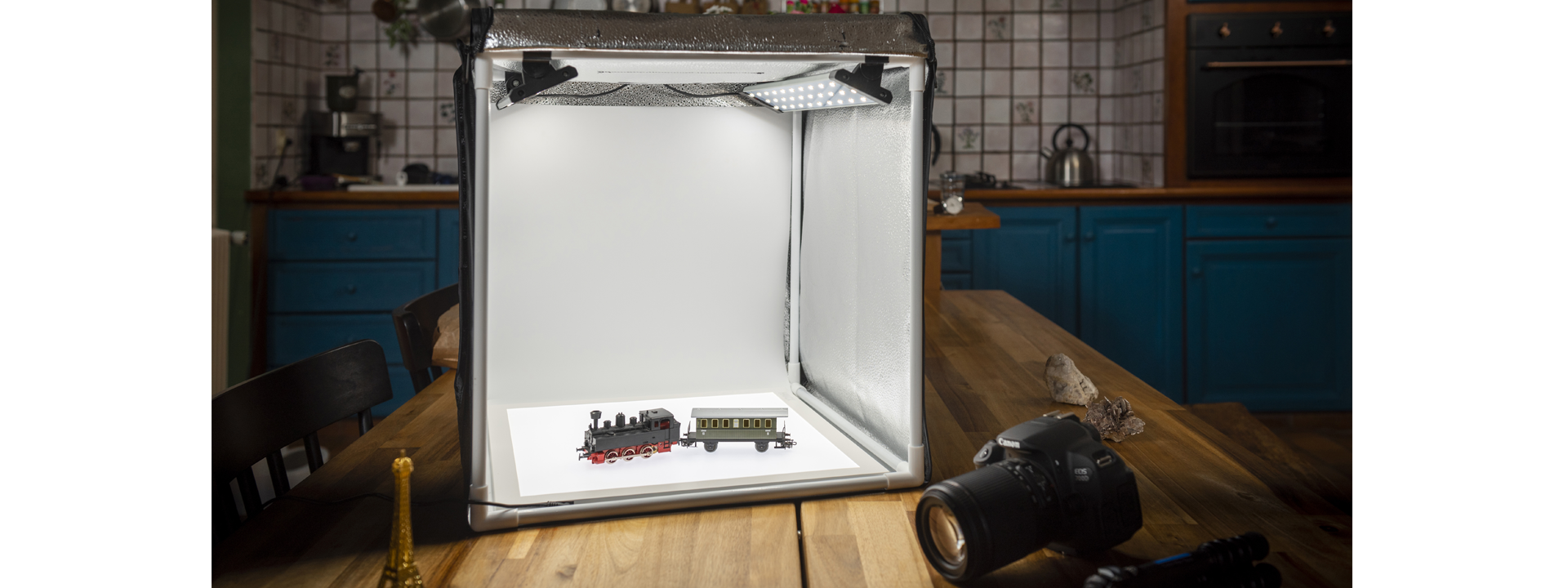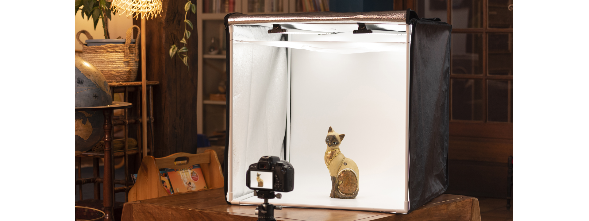 La serie HPB-60 può essere facilmente installata su qualsiasi scrivania per una produzione fotografica semplice e veloce. È adatta a prodotti di piccole e medie dimensioni, come scarpe, libri, accessori, gioielli e modellini.