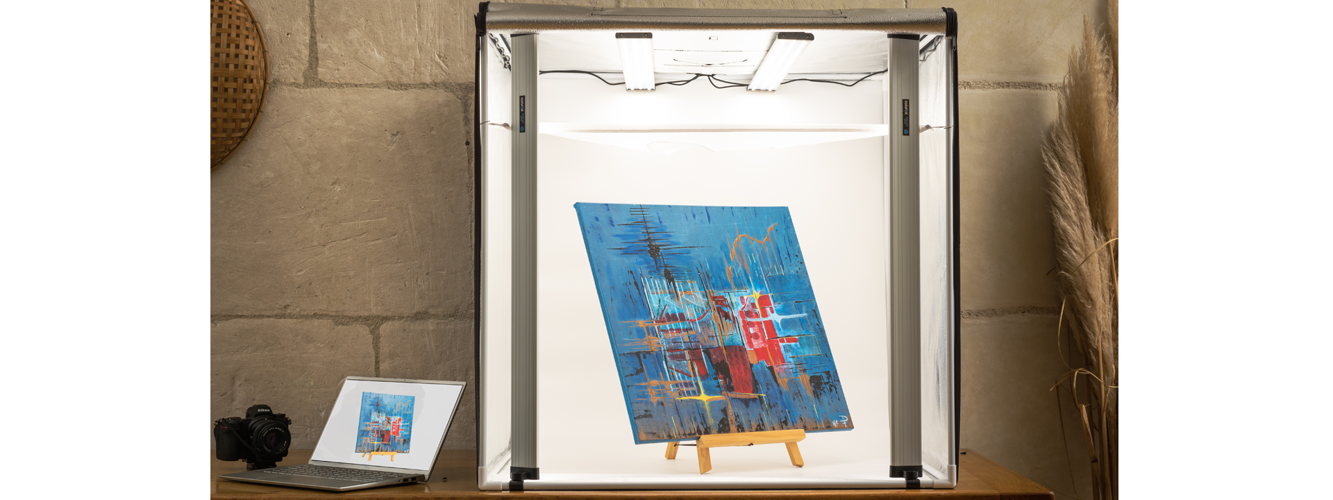 L'illuminazione è modulabile e inclinabile, perfetta per realizzare primi piani e mettere in risalto i dettagli unici. È particolarmente utilizzata per opere d'arte, prodotti di grandi dimensioni, foto a figura intera, ritratti, manichini vestiti per abbigliamento e accessori.